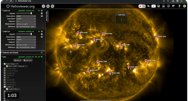 @NASASun on X • August 3rd, 2023 Helioviewer Want to see what the Sun is up to? Check out Helioviewer, a visualization tool supported by NASA’s Solar Data Analysis Center. It’s like using your favorite map app on the Sun!